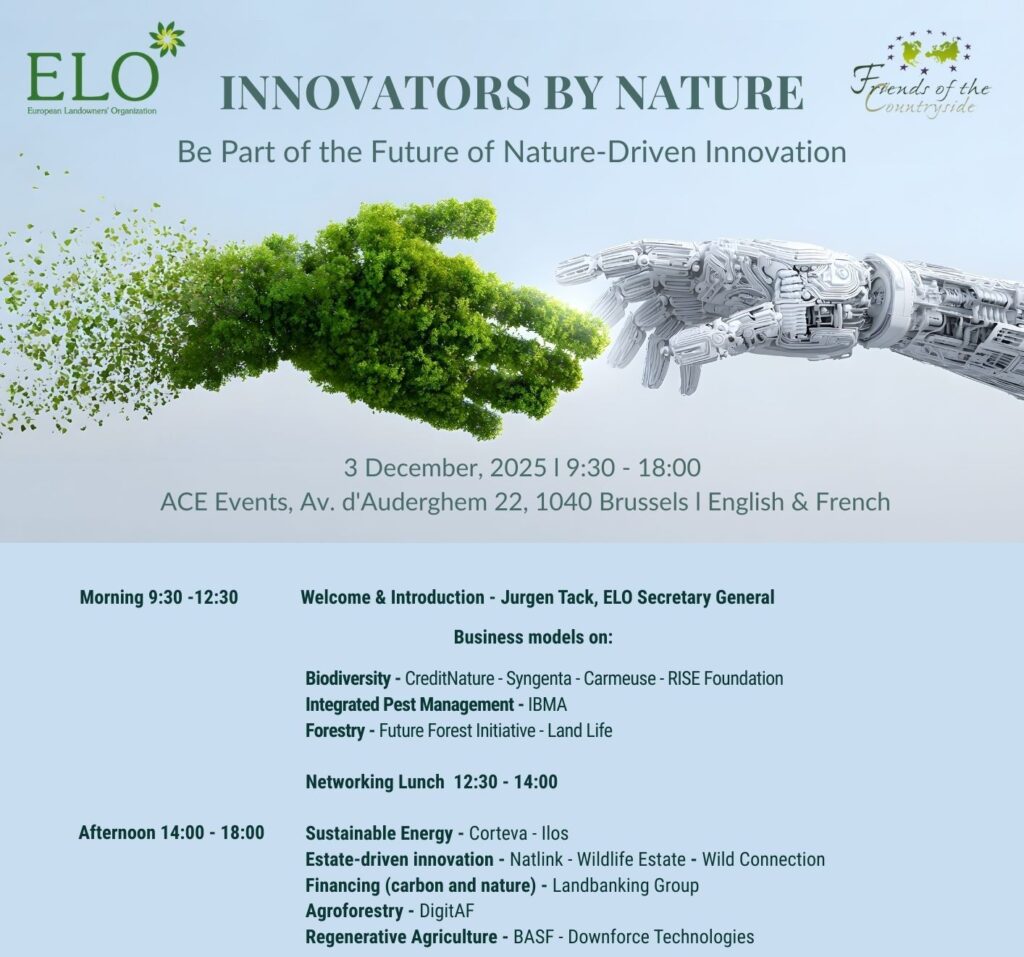 Innovators by Nature est un rassemblement de haut niveau réunissant les propriétaires fonciers, investisseurs, décideurs politiques et entrepreneurs environnementaux les plus visionnaires d’Europe. Organisé par l’ELO et Friends of the Countryside à Bruxelles, l’événement met en lumière des modèles économiques évolutifs à l’intersection de la nature, de l’entreprise et de l’innovation. La conférence se déroulera en anglais, avec une traduction simultanée en français.