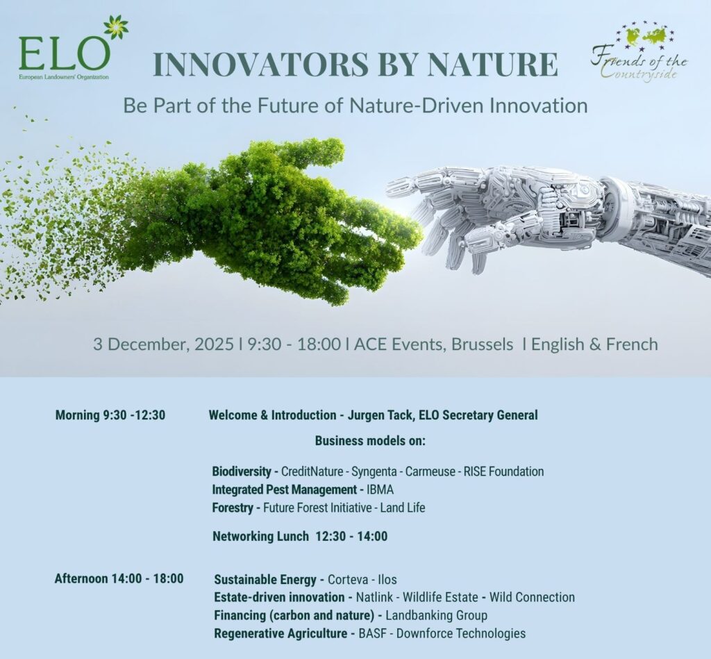 Innovators by Nature is a high-level gathering of Europe’s most visionary landowners, investors, policymakers, and environmental entrepreneurs. Organized by ELO and Friends of the Countryside in Brussels, the event showcases scalable business models at the crossroads of nature, enterprise, and innovation. The conference will be held in English, with live translation into French provided.