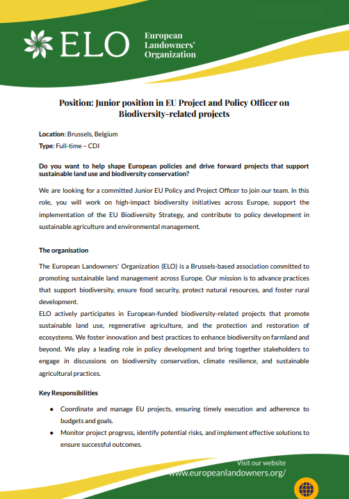 We are looking for a committed Junior EU Policy and Project Officer to join our team. In this role, you will work on high-impact biodiversity initiatives across Europe, support the implementation of the EU Biodiversity Strategy, and contribute to policy development in sustainable agriculture and environmental management.