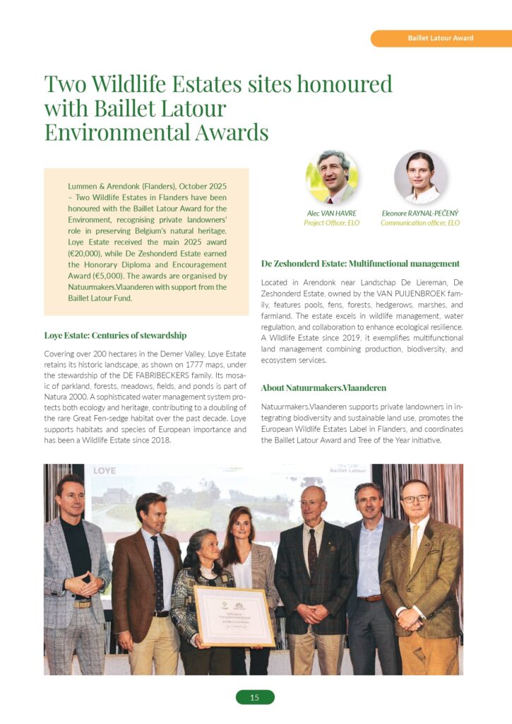 Lummen & Arendonk (Flanders), October 2025 – Two Wildlife Estates in Flanders have been honoured with the Baillet Latour Award for the Environment, recognising private landowners’ role in preserving Belgium’s natural heritage. Loye Estate received the main 2025 award (€20,000), while De Zeshonderd Estate earned the Honorary Diploma and Encouragement Award (€5,000). The awards are organised by Natuurmakers.Vlaanderen with support from the Baillet Latour Fund.