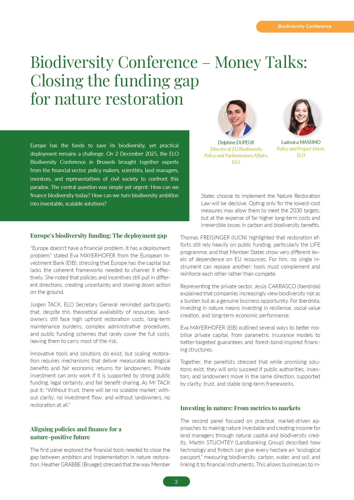 Europe has the funds to save its biodiversity, yet practical deployment remains a challenge. On 2 December 2025, the ELO Biodiversity Conference in Brussels brought together experts from the financial sector, policy makers, scientists, land managers, investors, and representatives of civil society to confront this paradox. The central question was simple yet urgent: How can we finance biodiversity today? How can we turn biodiversity ambition into investable, scalable solutions?