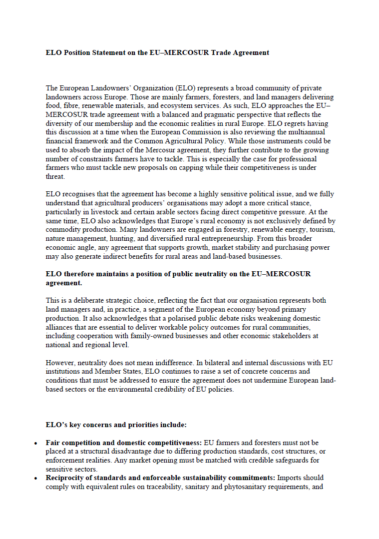 The European Landowners’ Organization (ELO) represents a broad community of private landowners across Europe. Those are mainly farmers, foresters, and land managers delivering food, fibre, renewable materials, and ecosystem services. As such, ELO approaches the EU– MERCOSUR trade agreement with a balanced and pragmatic perspective that reflects the diversity of our membership and the economic realities in rural Europe. ELO regrets having this discussion at a time when the European Commission is also reviewing the multiannual financial framework and the Common Agricultural Policy. While those instruments could be used to absorb the impact of the Mercosur agreement, they further contribute to the growing number of constraints farmers have to tackle. This is especially the case for professional farmers who must tackle new proposals on capping while their competitiveness is under threat.