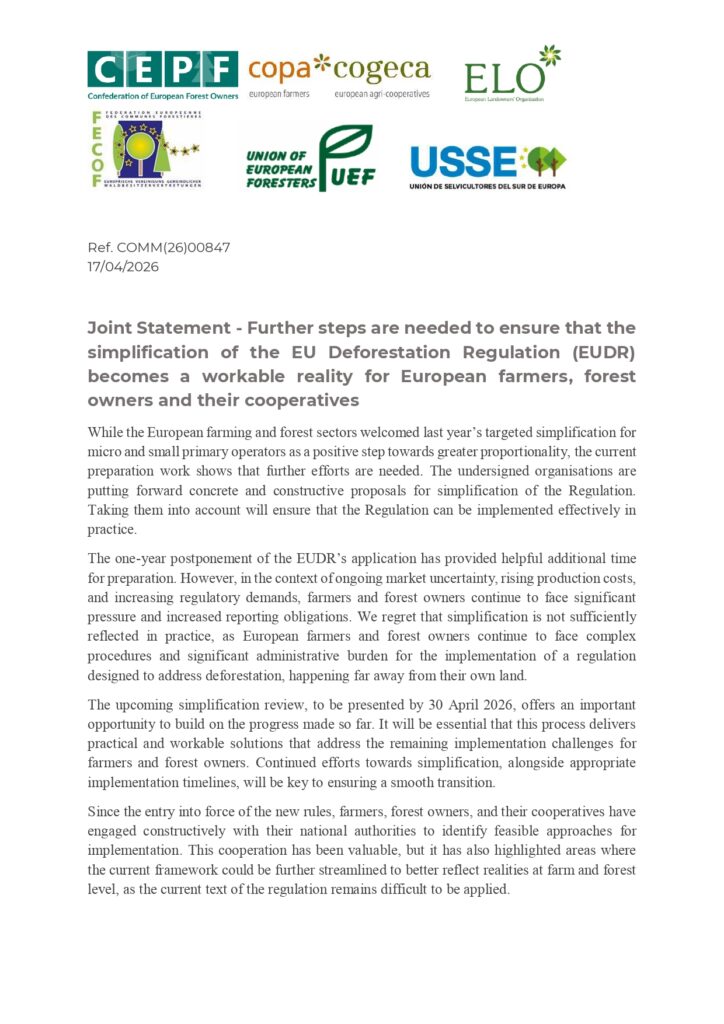 Joint Statement - Further steps are needed to ensure thatthe simplification of the EU Deforestation Regulation (EUDR) becomes a workable reality for European farmers, forestowners and their cooperatives