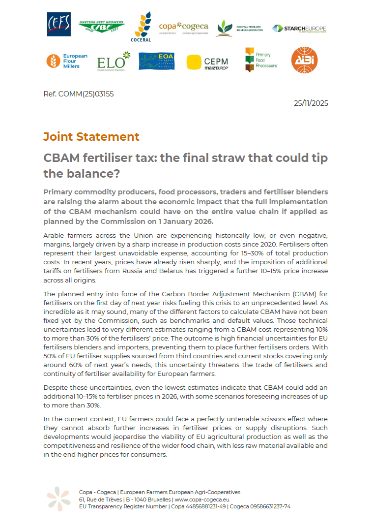 In a joint statement, a coalition of primary commodity producers, food processors, traders and fertiliser blenders raises alarm about the economic impact that the full implementation of the CBAM mechanism could have on the entire value chain if applied as planned by the Commission on 1 January 2026. Ensuring clarity and predictability on CBAM obligations is essential for importers and traders to resume normal activity and secure fertiliser availability. Temporarily exempting fertilisers from CBAM until these prerequisites are fulfilled is the most effective way to avoid further price increases, secure supply continuity and support the sustainability of EU farming and food production.