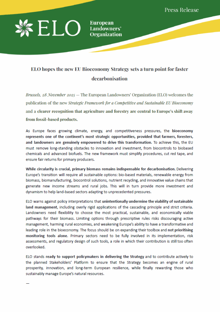 Brussels, 28 November 2025 — The European Landowners’ Organization (ELO) welcomes the publication of the new Strategic Framework for a Competitive and Sustainable EU Bioeconomy and a clearer recognition that agriculture and forestry are central to Europe’s shift away from fossil-based products.
