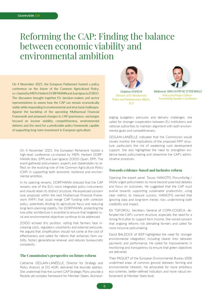 On 4 November 2025, the European Parliament hosted a policy conference on the future of the Common Agricultural Policy, co-chaired by MEPs Herbert DORFMANN and Juan Ignacio ZOIDO. The discussion brought together EU decision-makers and sector representatives to assess how the CAP can remain economically viable while responding to environmental and structural challenges. Against the backdrop of the upcoming Multiannual Financial Framework and proposed changes to CAP governance, exchanges focused on income stability, competitiveness, environmental delivery, and the need for a predictable policy framework capable of supporting long-term investment in European agriculture.