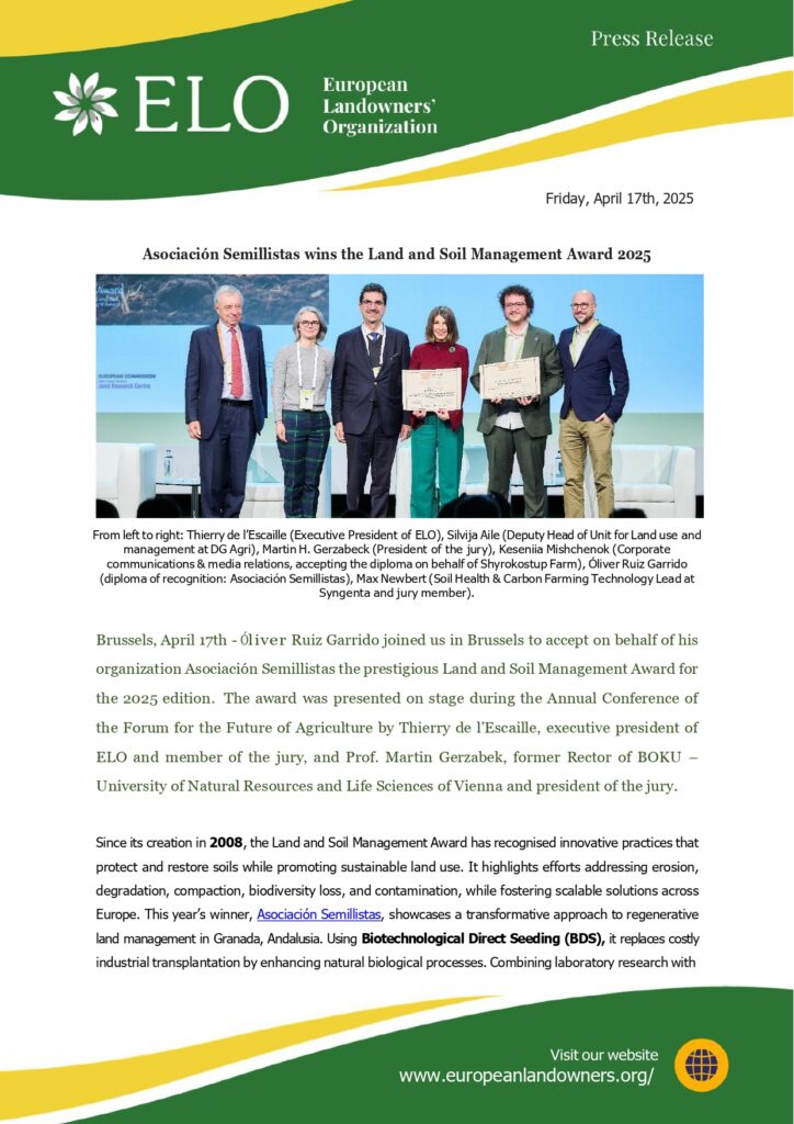 Brussels, April 14th – Óliver Ruiz Garrido joined us in Brussels to accept on behalf of his organization Asociación Semillistas the prestigious Land and Soil Management Award for the 2026 edition. The award was presented on stage during the Annual Conference of the Forum for the Future of Agriculture, by Thierry de l’Escaille, member of the jury, and Prof. Martin Gerzabek, former Rector of BOKU – University of Natural Resources and Life Sciences of Vienna.